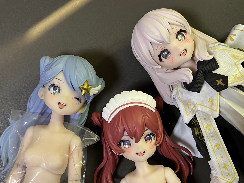 받아보니 왜 인기가 많은지 이해는 가는데, 역시 얼굴 크기가 너무 작아지면서 생기는 문제는 확실히 있는듯. 제조사 욕심이 과한것같다. 나도 안구 끼우는 헤드를 페인팅헤드보다 훨씬훨씬 좋아하지만, 이 정도로 헤드가 작아지면 페인팅이 나은듯. 안구 시선 문제 때문에 모든 타입이 앞머리로 눈을 슬쩍슬쩍 가리고 있는 것으로 보인다.